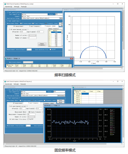 最大14ch同步测量 通过在测量模组的同时,测量各电芯的阻抗,从而可掌握电池模组内部的状态差异。支持频率扫描测量和固定频率测量 除了通过频率扫描的Cole-Cole方式,还可利用单频或双频连续测量功能,监视FC电池模组中的状态变化。